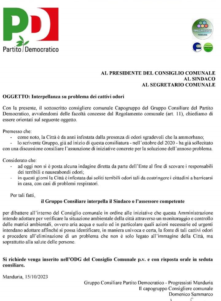 Sui cattivi odori in città, interviene anche il consigliere comunale del Pd, Domenico Sammarco. Ecco il suo intervento.