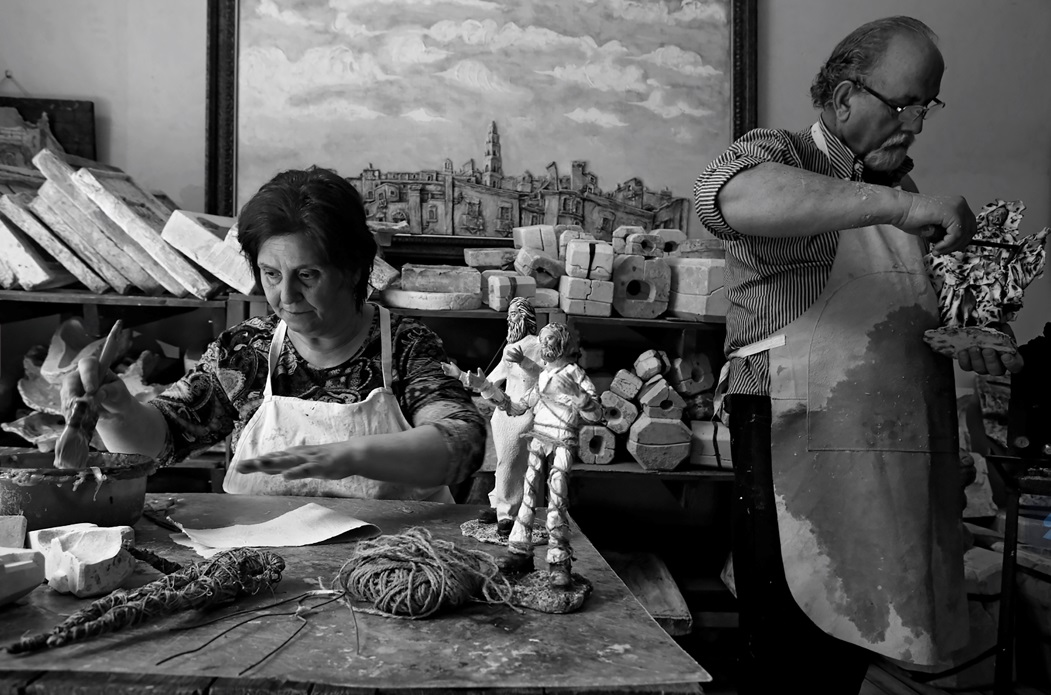Luigi Baldari, Cartapestaio – Lecce. È l’unico in Italia, forse al mondo, a creare la carta da strofinacci di cotone. Mette i suoi fogli ad asciugare per ore, e poi li modella per vestire le sue opere. Luigi Baldari è un orgoglioso maestro cartapestaio leccese, che lavora insieme a sua moglie Maddalena in una piccola bottega artigiana nel cuore di Lecce, a pochi passi da Porta Napoli. Qui hanno realizzato il loro "Museo dei mestieri della memoria" popolato da manufatti originali, volti scolpiti nella terracotta e avvolti nella carta dipinta a mano.