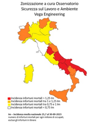 La zonizzazione a colori è la nuova rappresentazione grafica elaborata dall’osservatorio sicurezza sul lavoro e ambiente Vega Engineering di Mestre per fotografare il livello di sicurezza dei lavoratori.