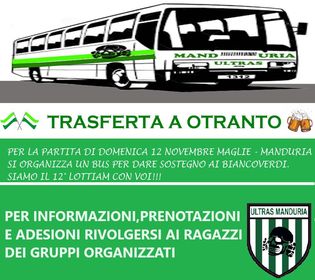 Per la trasferta del Manduria di domenica prossima a Otranto, i tifosi biancoverdi organizzano un pullman.