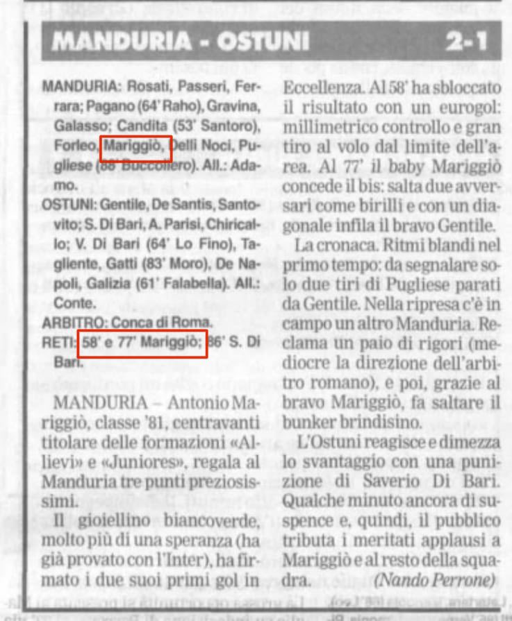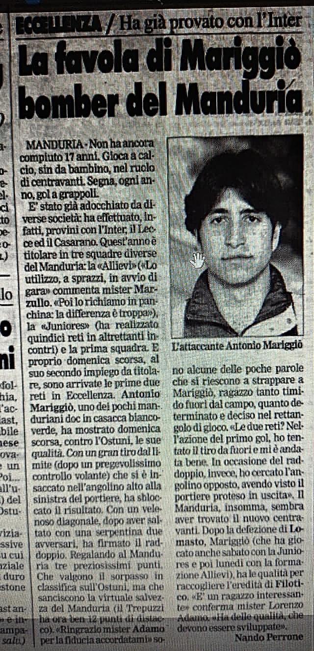 Tutto sotto gli occhi di Antonio Mariggiò, attuale team manager del Manduria ed ex attaccante biancoverde che esordì, pensate un po’, 26 anni fa (circa) a sedici anni, proprio come Daniele. La mente viaggia e va veloce, le sensazioni sono le stesse, il mal di pancia pure. Stagione 1997-1998, come riporta un articolo a firma del giornalista Nando Perrone, che lo definì “l’attaccante delle tre categorie”: Allievi, Juniores e prima squadra. Baby prodigio e bomber del futuro.