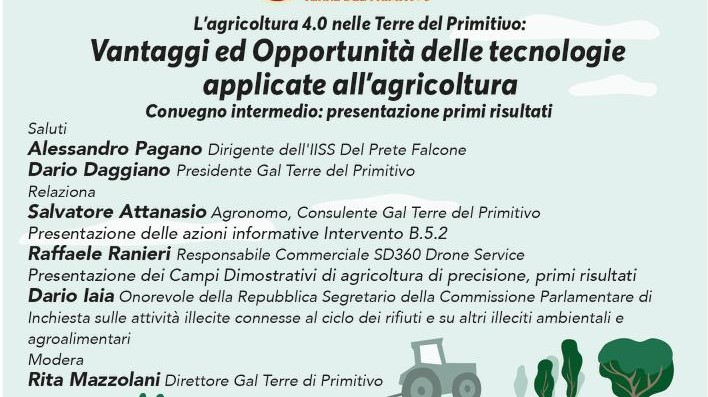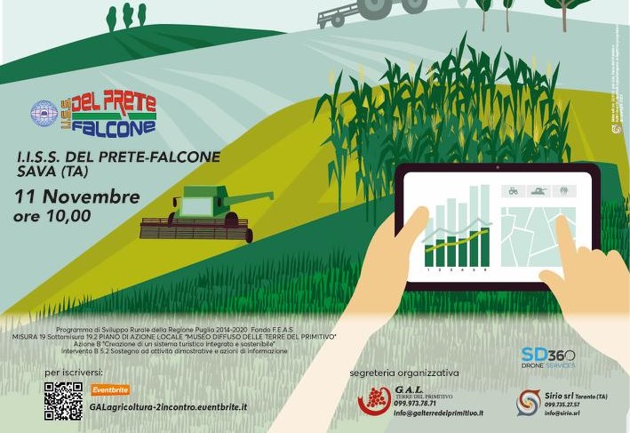 Domani (sabato 11 novembre) presso l’istituto Del Prete Falcone di Sava avrà luogo il convegno sul tema “Verso l’agricoltura 4.0 nelle Terre del Primitivo - Le opportunità delle tecnologie applicate all’agricoltura”. Moderato dal direttore del GAL Terre del Primitivo, Rita Mazzolani, il convegno promosso per la diffusione dei risultati intermedi, dopo l’introduzione del presidente del Gal Terre del Primitivo, Dario Daggiano e i saluti del dirigente scolastico dell’istituto Del Prete Falcone Alessandro Pagano, entrerà nel vivo dei lavori, con l’agronomo Salvatore Attanasio, consulente del Gal Terre del Primitivo, che presenterà i primi risultati conseguiti a seguito del programma e delle azioni informative svoltesi negli 11 comuni del comprensorio GAL. A seguire, l’intervento di Raffaele Ranieri, della società Skydrone360, azienda fornitrice della strumentazione di agricoltura di precisione, che presenterà i risultati provenienti dai 3 campi dimostrativi.