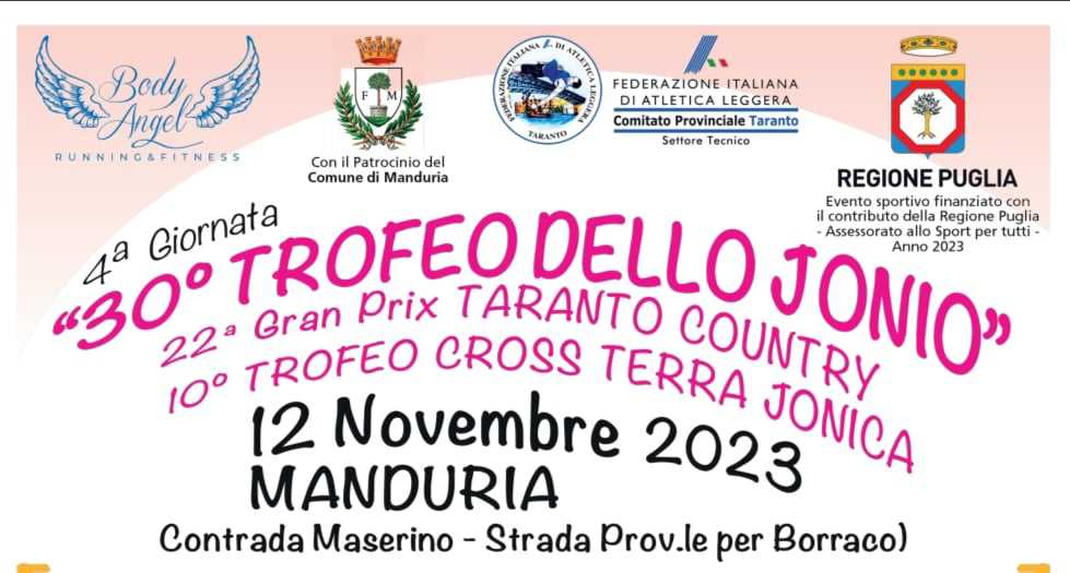 Una vera e propria festa dello sport per la quarta giornata della XXX edizione del “Trofeo dello Jonio”, nonché la 22ª edizione del Gran Prix “Taranto Country” e la X edizione del “Trofeo Cross Terra Jonica”, promossa dal Comitato Provinciale della Fidal e dall’A.S.D. Body Angel, con il patrocinio del Comune di Manduria e con il contributo dell’assessorato allo Sport della Regione Puglia.