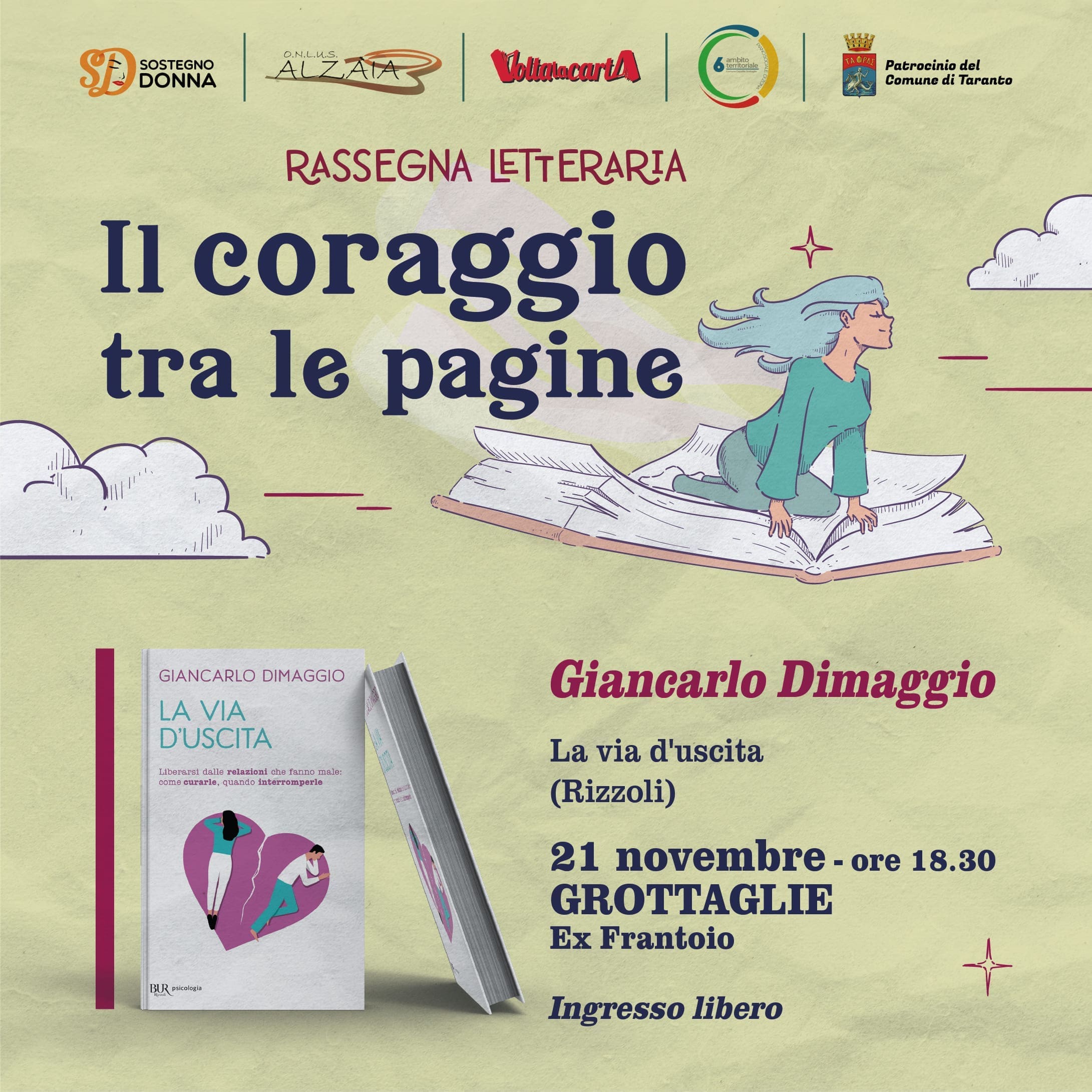 Altra interessante iniziativa organizzata da Alzàia onlus insieme all’associazione Volta la carta è la rassegna letteraria “Il coraggio tra le pagine”, già partita lo scorso 9 novembre con l’incontro con Camilla Ronzullo, in arte Zelda was a Writer, e che vedrà altri tre appuntamenti con importanti autori, tra Taranto e Grottaglie. L’intento è quello di aprire una discussione, attraverso i libri, su temi che il CAV affronta ogni giorno nel proprio operato: autodeterminazione, relazioni, libertà di scelta, stereotipi, diritti, consapevolezza, riscatto. Il prossimo appuntamento è in programma martedì 21 novembre (ore 18.30) all’Ex frantoio di Grottaglie: sarà presente Giancarlo Dimaggio con il quale si parlerà del suo ultimo libro, “La via d’uscita” (Rizzoli). Psichiatra e psicoterapeuta, Dimaggio è cofondatore del Centro di Terapia Metacognitiva Interpersonale di Roma e uno dei massimi esperti internazionali sul trattamento dei disturbi di personalità. Nel suo saggio, da poco uscito, compie un viaggio nelle meccaniche profonde delle relazioni disfunzionali: cosa le tiene in piedi, e cosa fare per liberarsi dalla loro prigione. I successivi appuntamenti sono previsti il 2 dicembre (Mavie Da Ponte, “Fine di un matrimonio”, Marsilio) a Palazzo Pantaleo di Taranto e il 15 dicembre (Alice Urciuolo, “La verità che ci riguarda”, 66thand2nd) all’Ex frantoio di Grottaglie. A tal proposito, rappresentanti di Alzàia e di Volta la carta saranno presenti domenica 19 (ore 20.30) a Mercato Nuovo, ospiti del format Salotto Elettronico, per presentare al pubblico la rassegna letteraria.
