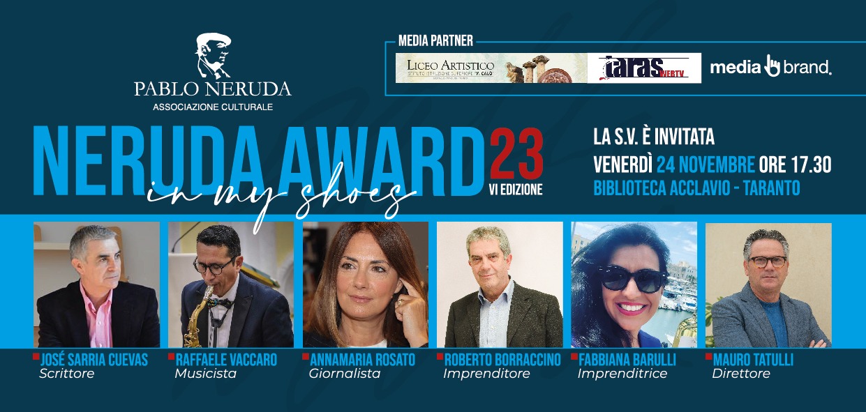 Torna l’appuntamento con il prestigioso “Neruda Award”, riconoscimento che l’associazione culturale Pablo Neruda consegna nelle mani di chi, in vari ambiti, si distingue nel territorio con la propria storia e le proprie azioni. Venerdì 24 novembre nell’ agorà della Biblioteca Acclavio di Taranto alle ore 17.30 i giornalisti Gabriella Ressa e Matteo Schinaia daranno il via alla VI edizione. Progetto e management di Saverio Sinopoli, fondatore e presidente dell’associazione Neruda, direzione letteraria di Maria Miraglia ed artistica del fotografo Francesco Marinaro.