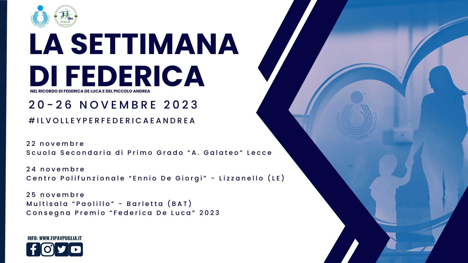 - cerimonia di consegna, presso il multisala “Paolillo” di Barletta nella mattina del 25 novembre 2023, del Premio Federica De Luca 2023, riconoscimento istituito dalla Federazione Italiana Pallavolo per ricordare Federica De Luca e riservato all’ufficiale di gara donna di categoria nazionale che si è particolarmente distinto per l’impegno e la passione a livello dirigenziale periferico durante il corso della stagione.