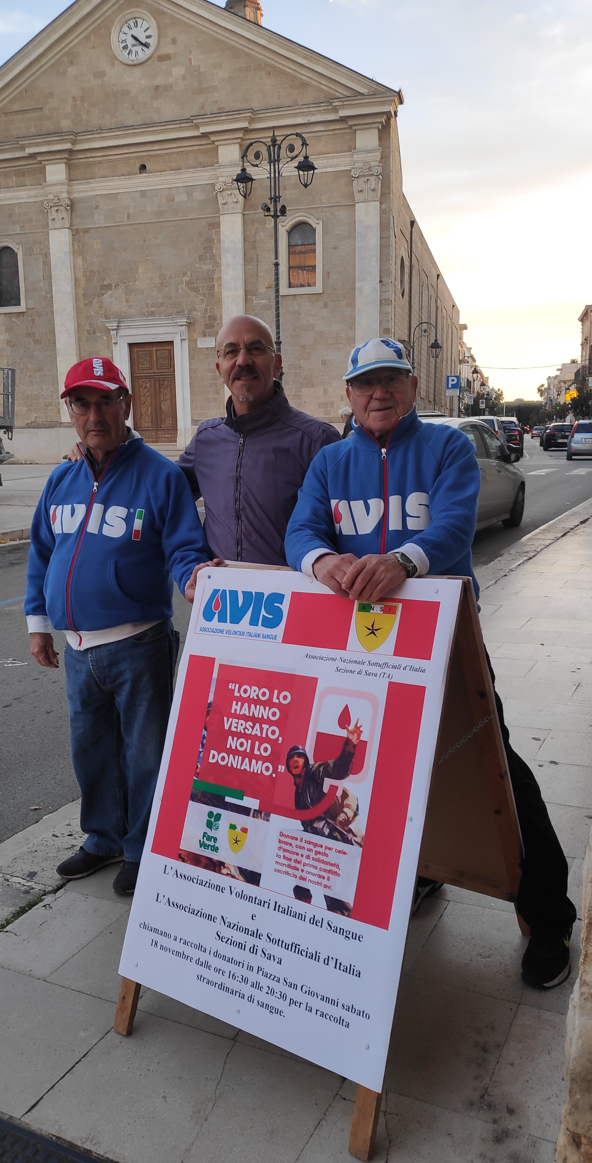«La donazione di sangue è avvenuta regolarmente ieri e ha avuto inizio alle ore 16:30» è riportato in una nota a firma di Giuseppe Natale, presidente della sezione A.N.S.I. di Sava. «I sanitari della A.S.L. di Taranto, giunti con l’autoemoteca in piazza San Giovanni, coadiuvati dai volontari dell’A.V.I.S. e con la collaborazione di alcuni soci dell’A.N.S.I., hanno accolto i cittadini volontari che hanno donato il sangue.