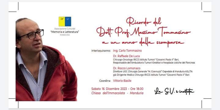 Sabato 16 dicembre, alle ore 18, la chiesa dell’Immacolata farà cornice all’iniziativa per ricordare il prof. Massimo Tommasino ad un anno dalla scomparsa, promossa dall’associazione culturale “Memoria e Letteratura” di Manduria.
