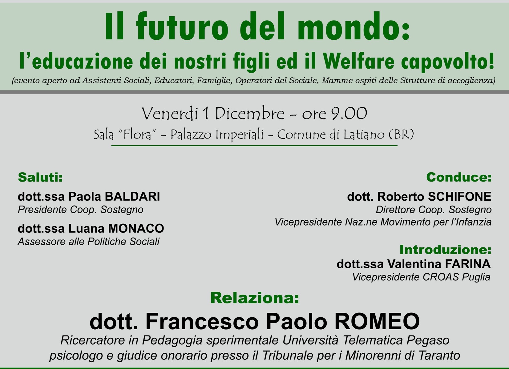 Si terrà giovedì 1 dicembre, con inizio alle ore 9 e fino alle ore 13, il convegno sul tema: “Il futuro del mondo: l’educazione dei nostri figli e il welfare capovolto”, organizzato dall’assessorato alle Politiche Sociali del Comune di Latiano e dalla soc. coop. soc. “Sostegno” sempre di Latiano.