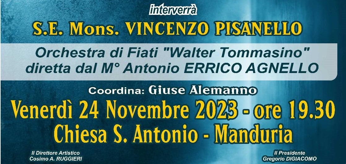 L'appuntamento, quindi, è a Manduria, per domani (venerdì 24 novembre), ore 19.30, presso la chiesa di Sant'Antonio.