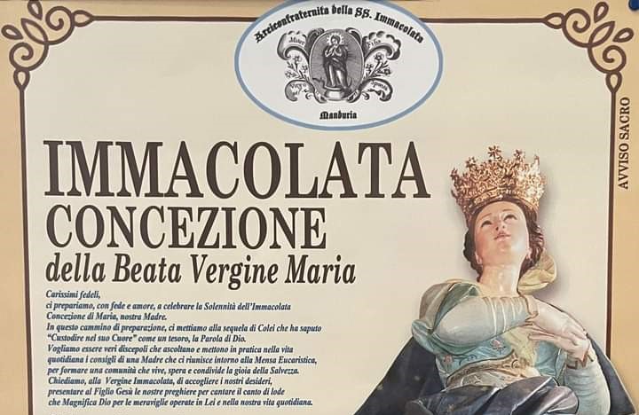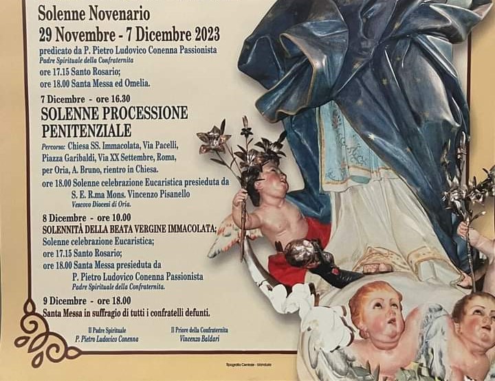 Reso pubblico il programma della festa in onore della Madonna Immacolata Concezione, approntato dal padre spirituale padre Pietro Ludovico Conenna e dal priore della Confraternita Vincenzo Baldari. Eccolo.