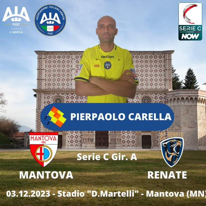 Pierpaolo Carella (AIA L’Aquila) designato come assistente della partita del girone A della serie C fra Mantova e Renate. E’ in programma domenica prossima, alle 18,30, nello stadio “Martelli” di Mantova.