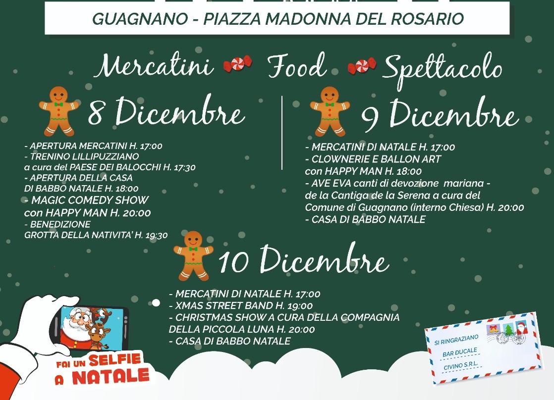 Sabato 9 dicembre il Mercatino di Natale riaprirà alle 17, si potrà visitare la Casa di Babbo Natale e dalle 18 simpaticissimi clown e la ballon art faranno divertire i più piccoli. Poi, dalle 20, nella chiesa madre, andrà in scena Ave Eva, canti di devozione mariana de La Cantiga de la Serena, a cura del Comune di Guagnano.