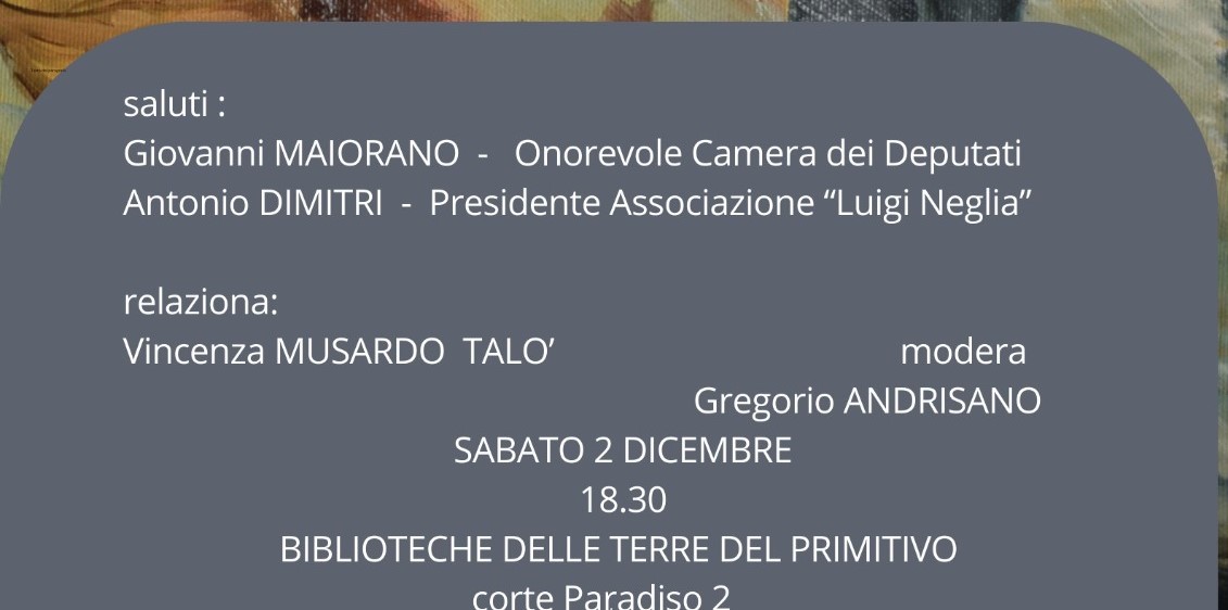 Il programma prevede, in apertura, i saluti dell’on. Giovanni Maiorano e del presidente dell’associazione “Don Luigi Neglia” Antonio Dimitri. Relazionerà Vincenza Musardo Talò.