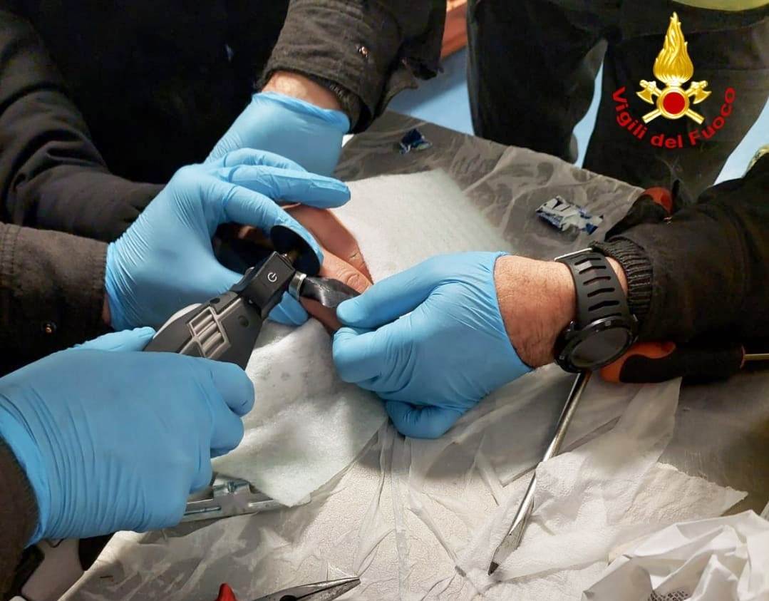 Si frattura il dito e, a causa del gonfiore, l’anello resta incastrato: necessario l’intervento dei vigili del fuoco per tagliare l’anello e liberare il dito. L’episodio si è verificato al Perrino di Brindisi: i vigili del fuoco hanno usato un utensile di falegnameria, il cosiddetto “dremel”. Poi i sanitari hanno potuto ingessare il dito.
