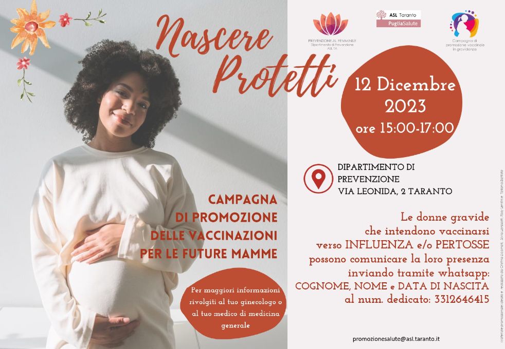 Martedì 12 dicembre, dalle ore 15:00 alle ore 17:00, si terrà presso la nuova sede del Dipartimento di Prevenzione (ex Baraccamenti Cattolica) in Via Leonida 2 a Taranto un incontro informativo e di promozione delle vaccinazioni in gravidanza, dedicato alle future mamme e ai futuri papà. Al termine dell'incontro, le future mamme, se lo vorranno, potranno vaccinarsi contro l'influenza stagionale e la pertosse, vaccinazioni sicure e raccomandate per le donne in gravidanza.