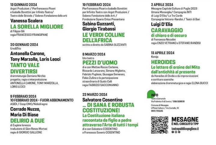 Otto appuntamenti totali, con un ruolo di primo piano per le eccellenze pugliesi che si sono ricavati uno spazio di primo piano nel panorama teatrale nazionale. Com’è per l’emozionante “Caravaggio di chiaro e di oscuro” di Luigi D’Elia, uno spettacolo coprodotto da “Mesagne Capitale Cultura di Puglia 2023” che sta riscuotendo consensi unanimi e applausi infiniti nei diversi teatri italiani che lo hanno già ospitato.