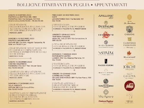 È fitto il calendario di appuntamenti con degustazioni, masterclass, abbinamenti, assaggi a tema “Bolle di Puglia” guidati da chi le bolle le produce, le comunica, le vende e propone in carta e a scaffale.