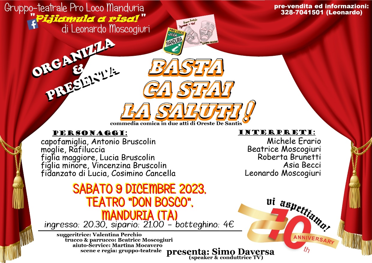 “Basta ca stai la saluti!”: uno sprono, un modo di dire, una pacca sulla spalla, ma soprattutto il titolo del nuovo lavoro della compagnia teatrale della Pro Loco di Manduria “Pijiamula a risa!” di Leonardo Moscogiuri che presenta in occasione del compimento dei loro primi dieci anni di vita: due atti piacevolissimi che proiettano lo spettatore in un clima di puro divertimento con battute impostate ad hoc, che rendono la commedia brillante, semplice da seguire e ricca di colpi di scena.
