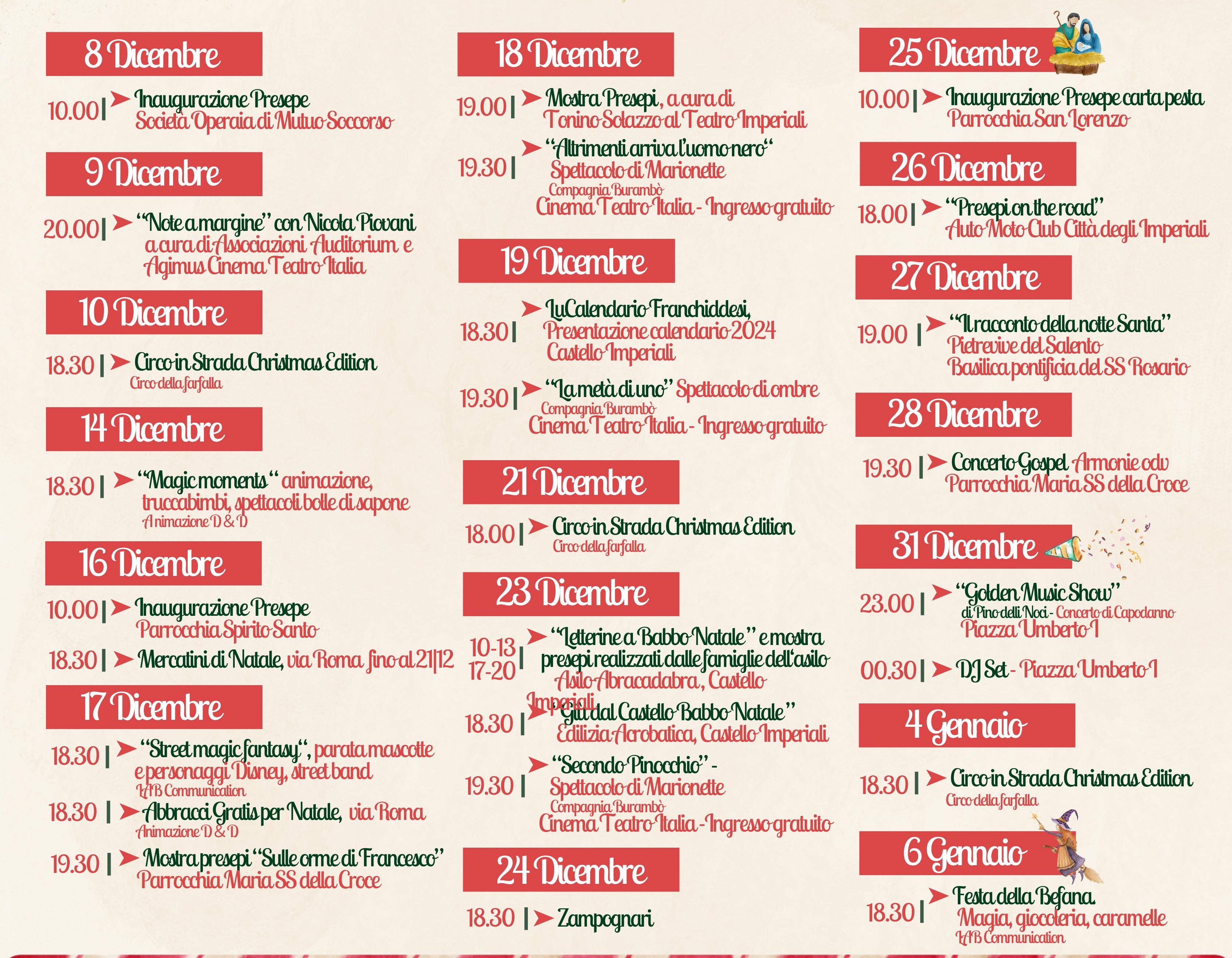 Come da tradizione tanti i momenti dedicati all’arte con le inaugurazioni dei presepi della Società Operaia (8 dicembre) e della parrocchia San Lorenzo (25 dicembre), delle mostre di arte presepiale “Sulle orme di Francesco” nella parrocchia della Croce (17 dicembre) e delle creazioni in cartapesta di Tonino Solazzo al teatro Imperiali (18 dicembre). È atteso anche il ritorno di Presepi on the road (26 dicembre), l’iniziativa a cura dell’Auto Moto Club Città degli Imperiali. L’arte sarà protagonista anche dei mercatini che saranno allestiti in via Roma dal 16 al 21 dicembre.
