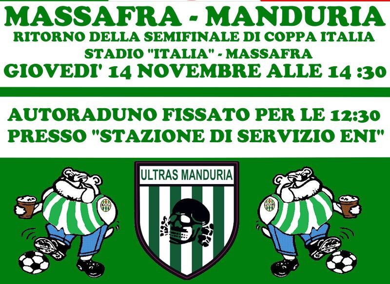I tifosi si organizzano in vista della trasferta di Massafra, luogo in cui, giovedì pomeriggio, si disputerà la semifinale di ritorno di Coppa Italia. Il Manduria ha vinto la gara d’andata con il punteggio di 1-0: anche il pareggio, pertanto, sarà utile per passare il turno.