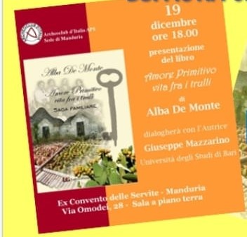 Martedì 19 dicembre, alle ore 18, nella sala presso l’ex convento delle Servite, al pianterreno, riprenderanno gli incontri culturali di Archeoclub con la presentazione del romanzo di Alba De Monte “Amore Primitivo vita fra i trulli – saga familiare”.