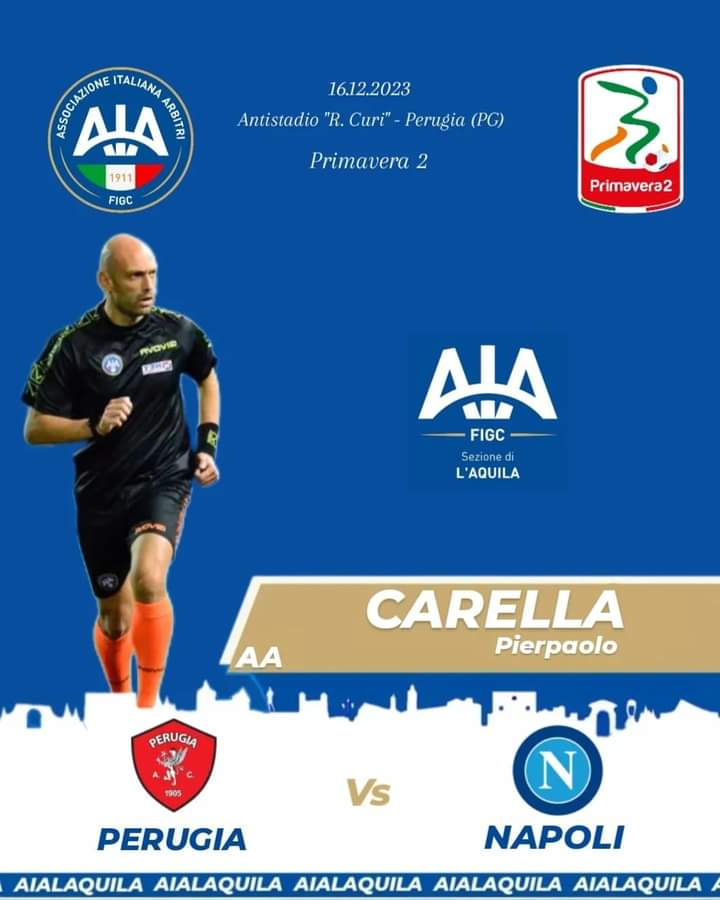 Pierpaolo Carella (AIA L’Aquila) designato come assistente di linea dell’incontro fra Perugia e Napoli. Si disputerà sabato pomeriggio (calcio d’inizio alle 14,30 presso l’antistadio “Curi” di Perugia) ed è inserito nel programma del campionato Primavera 2.