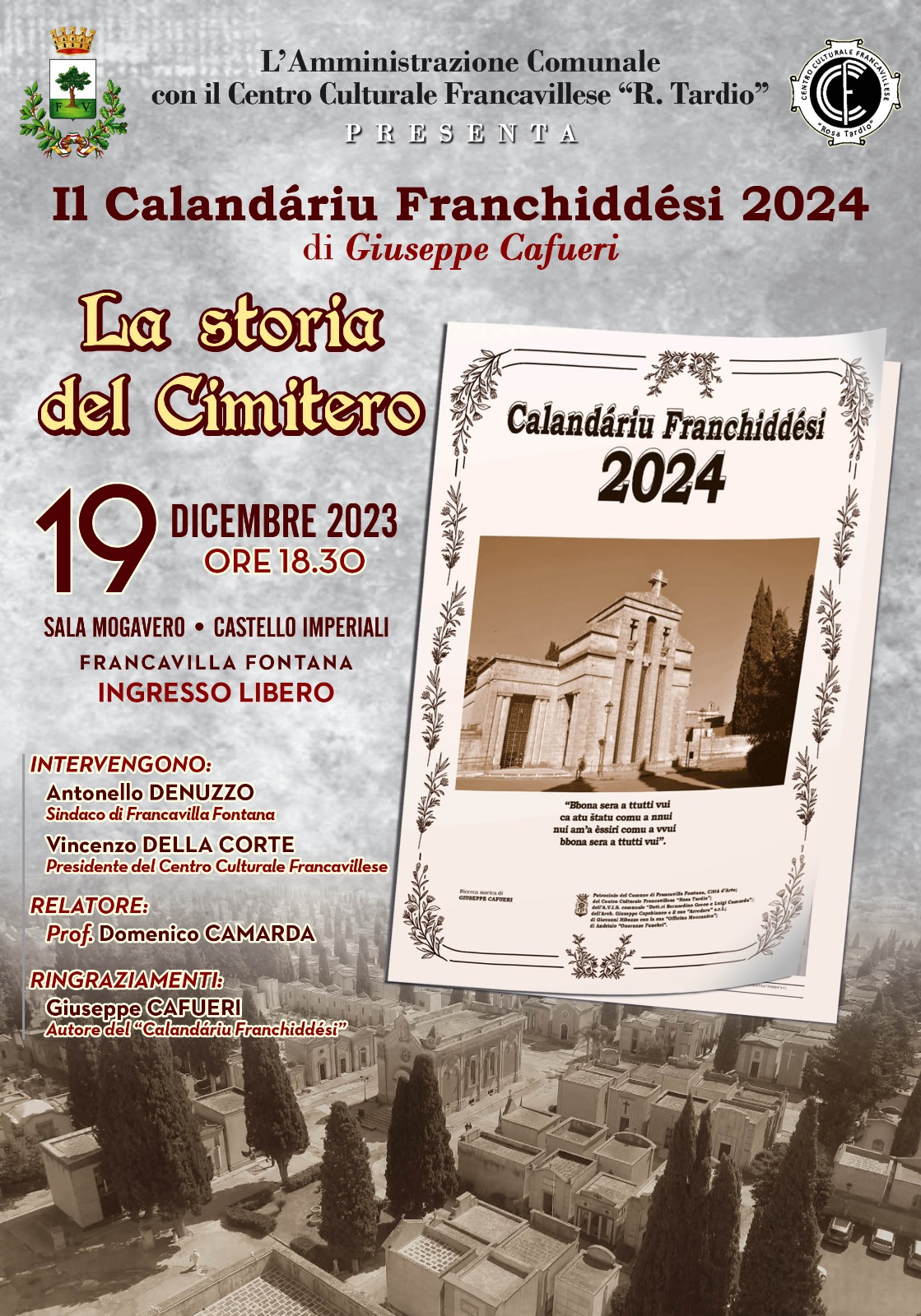 Come ha scritto il sindaco Antonello Denuzzo nell’introduzione dell’opera: «Pinuccio Cafueri, cui sono molto grato per l’immenso lavoro di ricerca che conduce ogni anno, ha scelto di raccontare il nostro Cimitero ripercorrendo una storia che ha avuto inizio nel 1804 a Saint-Cloud (Francia) con la Legge voluta da Napoleone che imponeva la sepoltura dei morti fuori dalle mura cittadine. In quel momento nasce l'idea di consegnare a Francavilla un luogo sacro, il Cimitero appunto, che continua a custodire testimonianze del tempo che scorre per la nostra comunità. Non si tratta solo di ricordi, ma di veri e propri documenti di pietra che con i loro stili diversi formano un patrimonio monumentale funebre degno di ammirazione. La lettura del Calandariu Franchiddese è, come ogni anno, una occasione preziosa di crescita. Complimenti al suo autore».