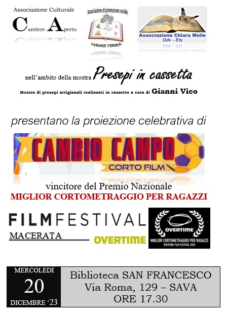 Questa sera, nella sala antistante l’esposizione, ci sarà la proiezione celebrativa del cortometraggio “Cambio Campo”, realizzato dall’associazione Chiara Melle nell’ambito del laboratorio di cinematografia del più ampio progetto “Bellezza e Legalità”