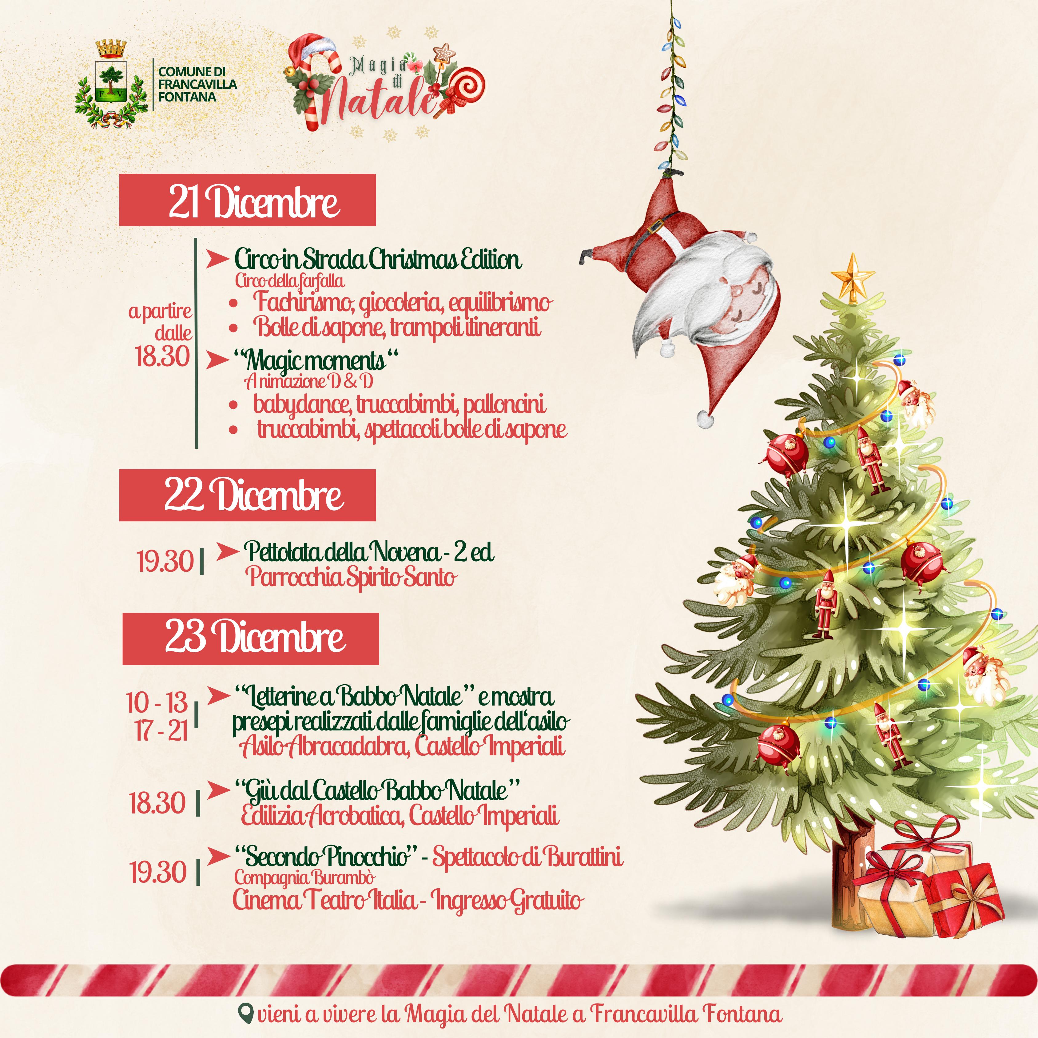 Oggi, giovedì 21 dicembre, dalle 18.30, Francavilla Fontana si trasformerà in un grande palcoscenico grazie a Circo in Strada – Christmas edition. Tra i monumenti e le suggestive strade del centro storico arriveranno artisti che sapranno incantare grandi e bambini con spettacoli di giocoleria, fachirismo ed equilibrismo. In contemporanea su via Roma sarà di scena "Magic moments" con babydance, truccabimbi, palloncini e spettacoli con bolle di sapone.