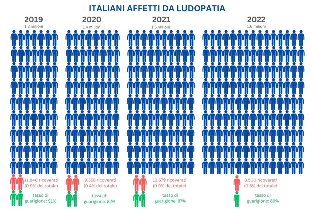 Il grafico che vi mostriamo è una rappresentazione visiva del numero di persone dipendenti dal gioco d’azzardo, del numero di coloro che cercano trattamento (ricoverati), e di coloro che sono considerati guariti. È evidente il grave divario tra il numero di persone dipendenti e quelle che cercano aiuto, e ulteriormente tra coloro che cercano aiuto e quelli che alla fine guariscono. Nonostante la gravità della dipendenza, una percentuale molto bassa di persone si rivolge al trattamento, ma la buona notizia è che la maggior parte di coloro che lo fanno riescono a guarire.