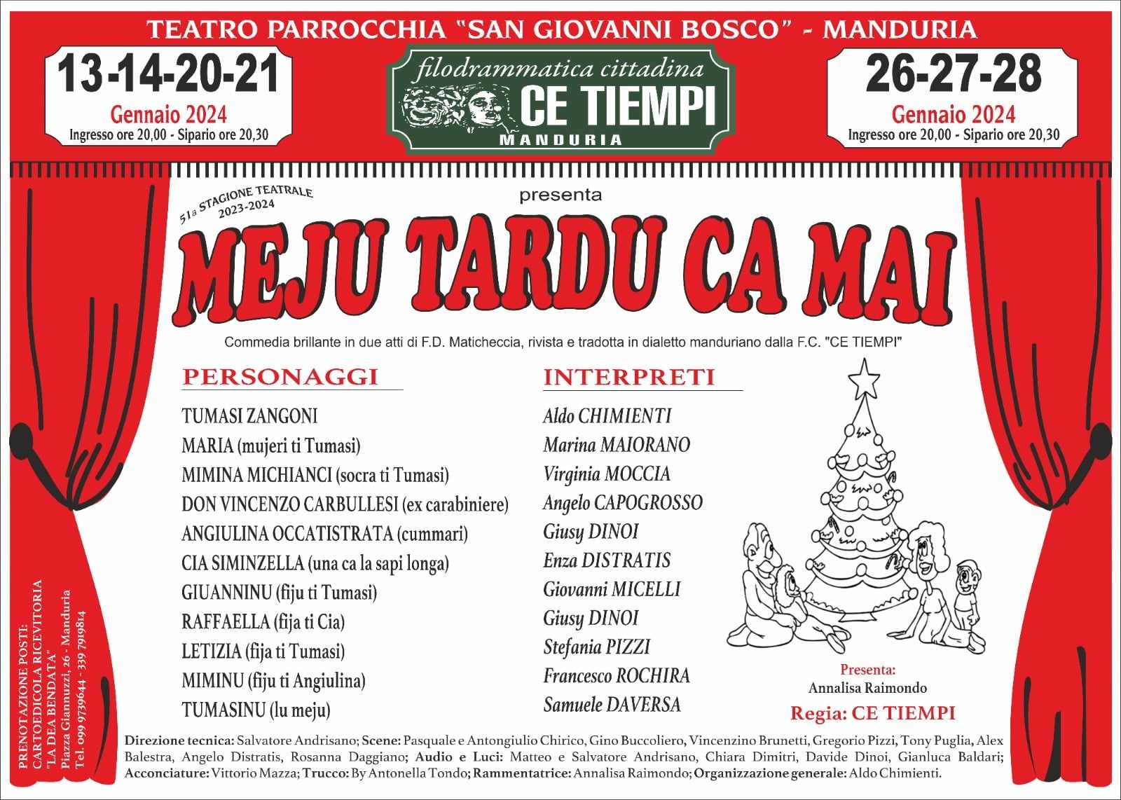 Formulando a tutti gli auguri di buon Natale e buone feste, la compagnia rende noti i personaggi della commedia e gli interpreti: