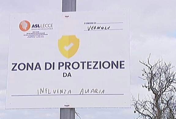 Il cartello in foto è uno dei segnali che delimitano la zona interessata dal focolaio di aviaria riscontrato in un allevamento avicolo in provincia di Lecce.