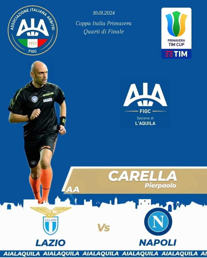 Pierpaolo Carella (AIA L’Aquila) designato come assistente per l’incontro Lazio-Napoli. Si tratta di una partita inserita nel programma della Coppa Italia Primavera: si svolgerà domani (con calcio d’inizio alle ore 12) a Formello.