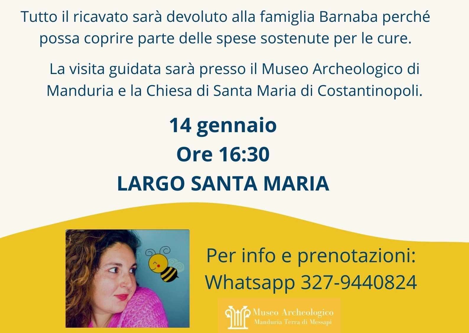 La visita guidata prevede il raduno alle ore 16,30 presso largo Santa Maria. E’ prevista la visita del museo archeologico di Manduria e della chiesa di Santa Maria di Costantinopoli.