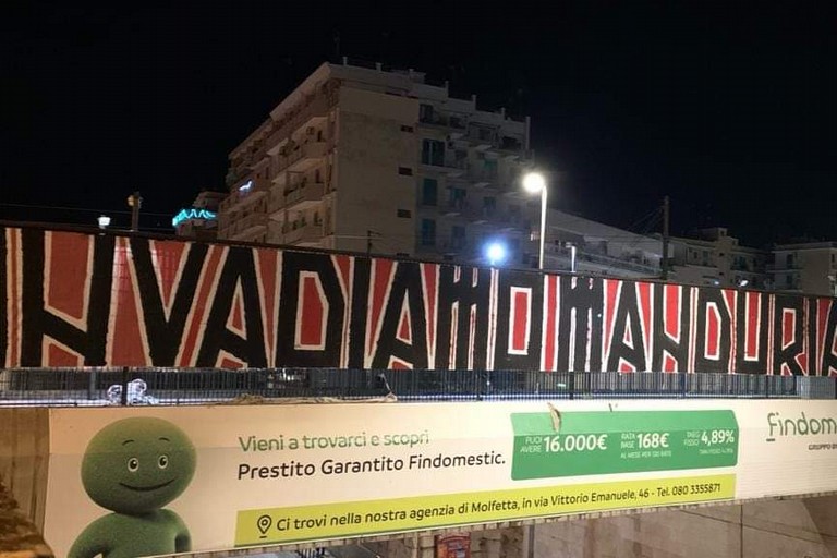 Intanto è stato affisso uno striscione dagli ultras della squadra barese: «Invadiamo Manduria».