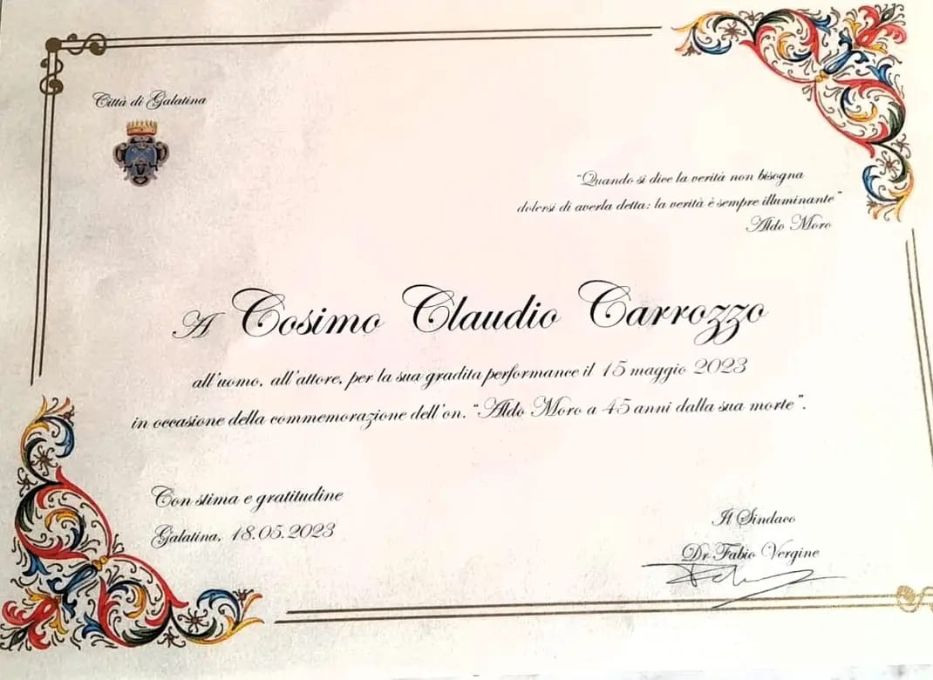 «Quello dell’interpretazione de “L’ultima lettera di Aldo Moro alla moglie” è stato per me l’evento più emozionante in cui ho partecipato nel 2023» il commento dell’attore manduriano Carrozzo. «Ho recitato quel testo, il 15 maggio scorso al Cavallino Bianco di Galatina, davanti ad una platea importantissima, ammutolita e commossa: erano presenti numerose autorità civili e militari tra cui il sindaco di Galatina Fabio Vergine, la presidente del Consiglio regionale pugliese, Loredana Capone, il deputato Bruno Tabacci, gli ex parlamentari Pierluigi Castagnetti, Gero Grassi e Giorgio De Giuseppe, Giancarlo Vallone, Roberto Marti e Sebastiano Leo».