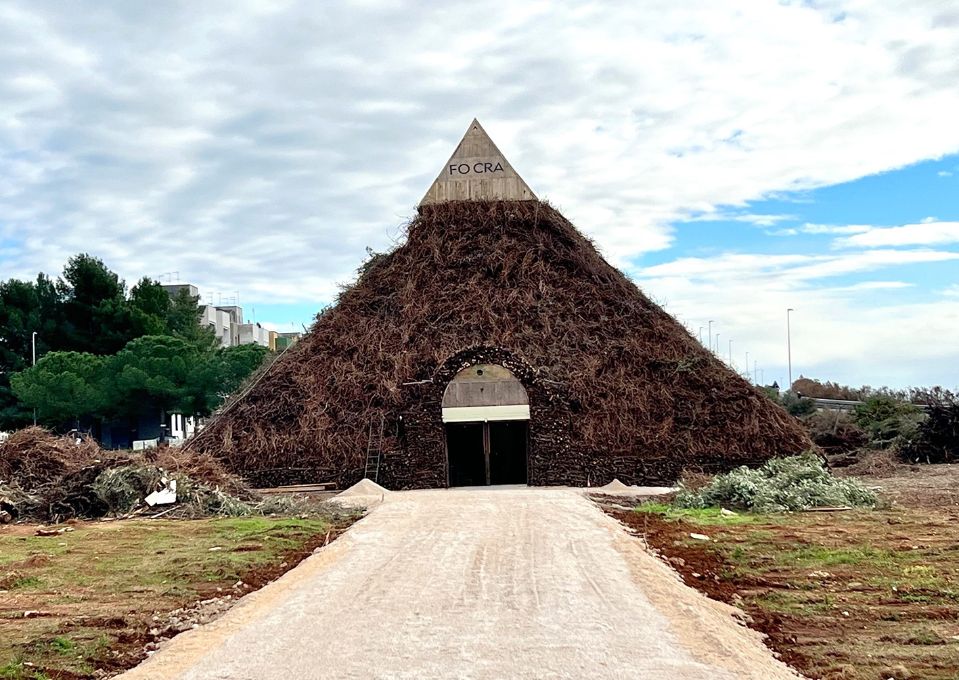 Realizzata con le fascine di legna d’ulivo e con i tralci delle viti portati dai fedeli per devozione, la foc’ra dell’edizione 2024 ha una base quadrata di 23 per 23 metri, un’altezza di 22 metri ed è l’unica, tra tutti i falò delle località dei riti del fuoco, ad avere una camera interna visitabile