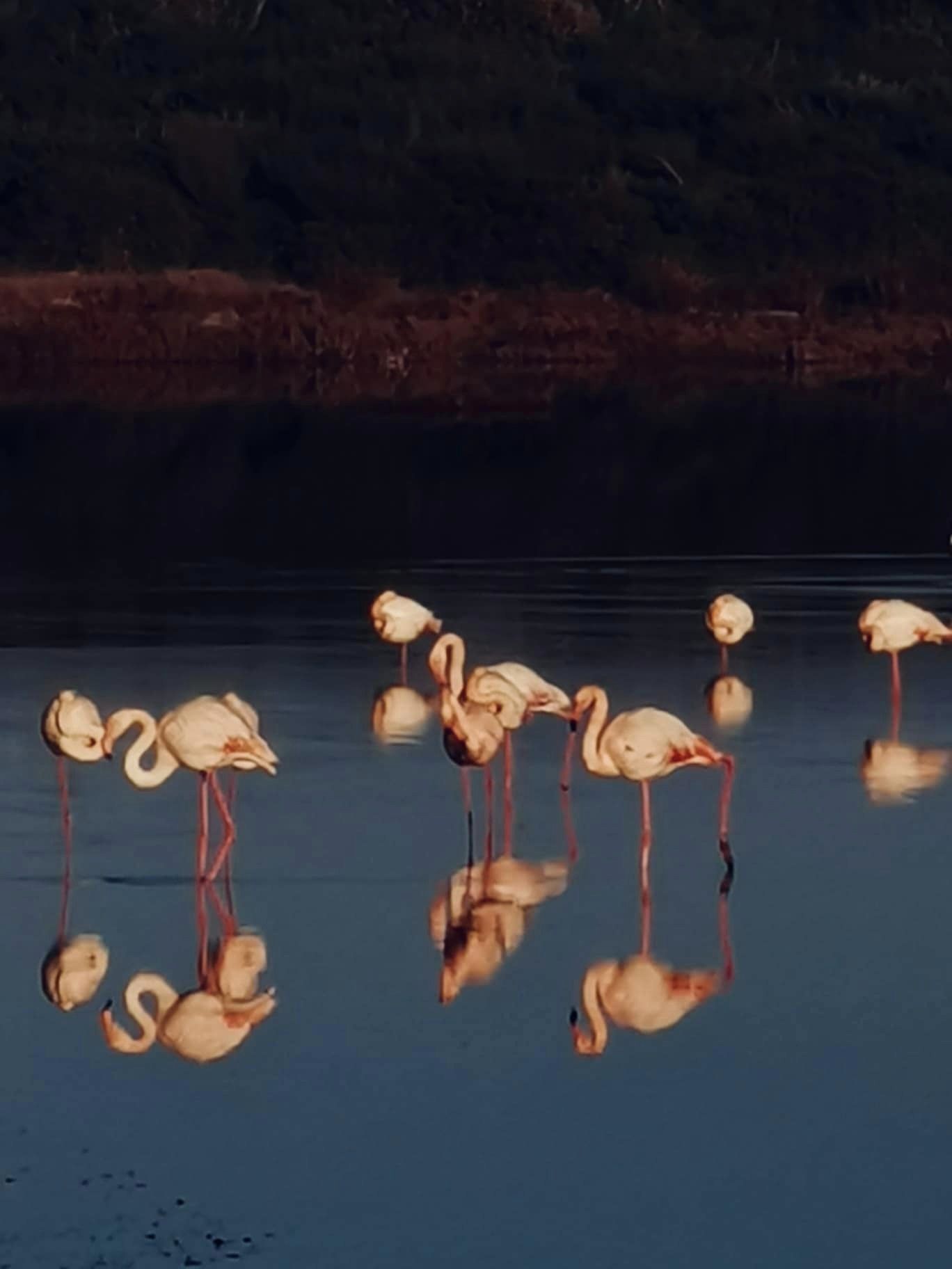 La torre costiera in primo piano, la Salina con i fenicotteri e un scorcio della località turistica
