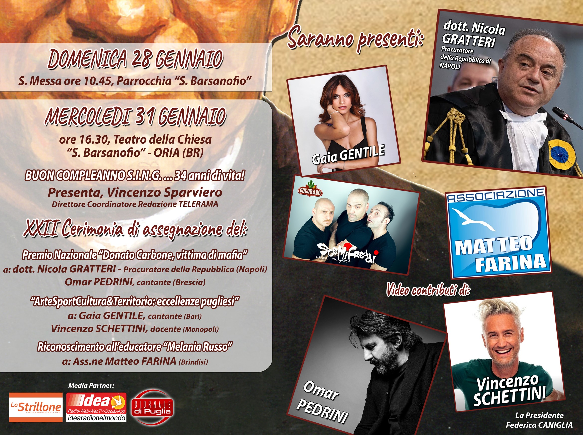La festa si terrà il prossimo 31 gennaio, alle ore 16.30, presso il teatro della chiesa “San Barsanofio” in Oria, la serata sarà presentata da Vincenzo Sparviero, direttore coordinatore della redazione di TeleRama.
