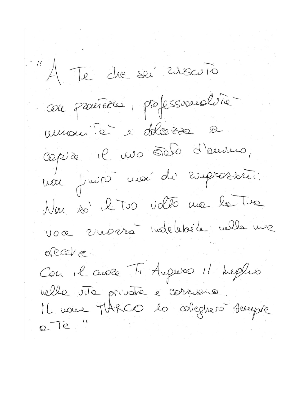 In questi giorni la donna ha recapitato una lettera in cui ha espresso tutta la sua gratitudine nei confronti di quel Carabiniere scrivendo: «A te che sei riuscito con prontezza, professionalità, umanità e dolcezza a capire il mio stato d'animo, non finirò mai di ringraziarti» ha scritto la donna. «Non conosco il tuo volto, ma la tua voce rimarrà indelebile nelle mie orecchie. Con il cuore ti auguro il meglio nella vita privata e carriera. Il nome Marco lo collegherò sempre a te».