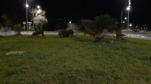 Le immagini mostrano una mandria di cinghiali a spasso a San Cataldo, marina di Lecce, sul Lungomare Sebastiano Caboto.