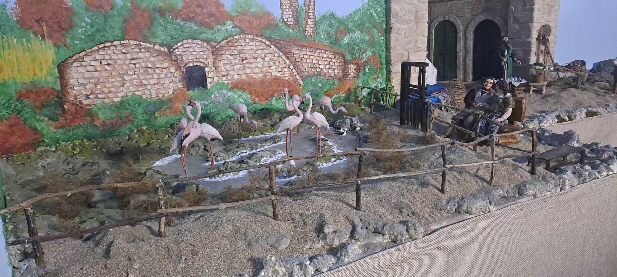 Quest’anno il presepe è stato arricchito con la Salina e i fenicotteri (nella foto), il mare, la torre costiera di Torre Colimena con i suoi agavi e il fico d’India