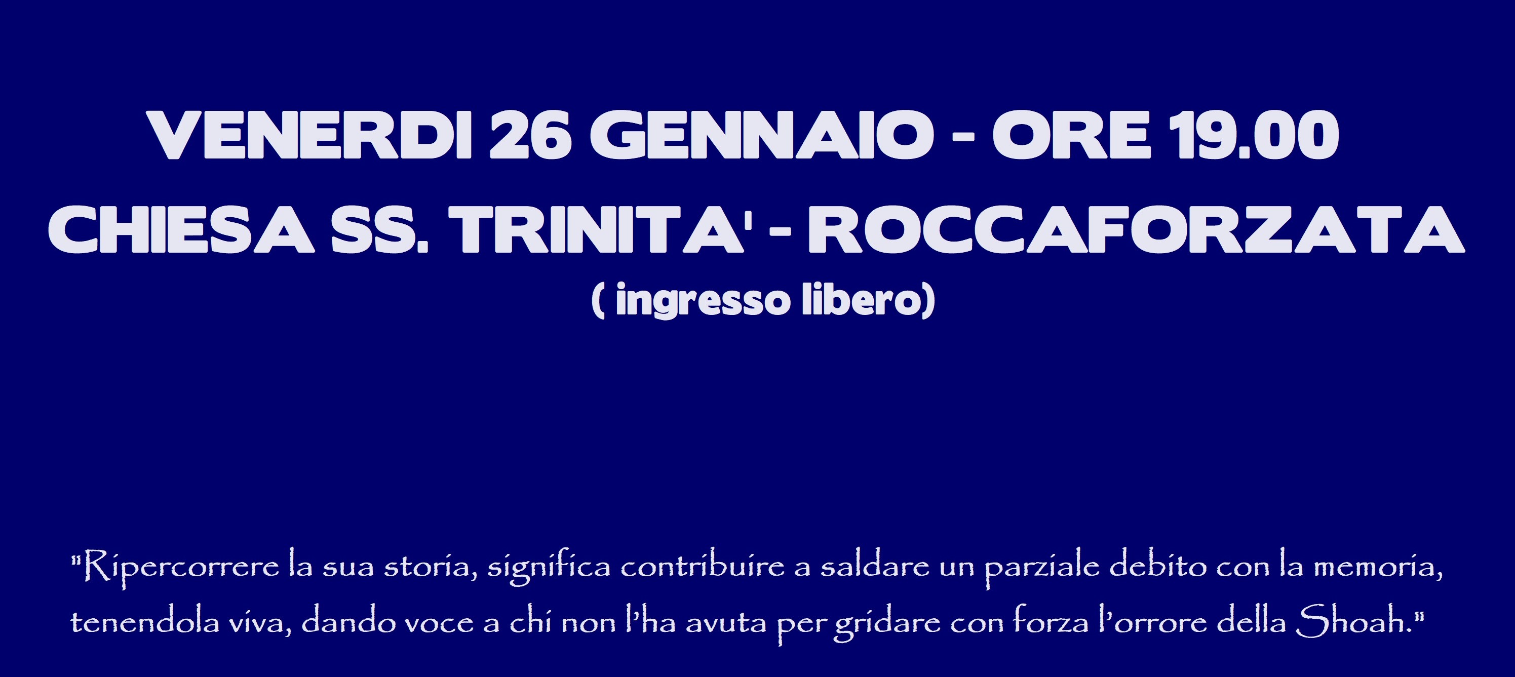 Sabato 27 gennaio, giorno in cui ricade la celebrazione della Giornata della Memoria, l’Anpi prenderà parte all’iniziativa “Musica e parole – per non dimenticare”, che si terrà alle ore 16, sempre nella chiesa SS. Trinità organizzata dalla Pro Loco Roccaforzata, circolo ANSPI Madonna della Camera Roccaforzata e parrocchia dove interverrà il presidente provinciale ANPI Riccardo Pagano.