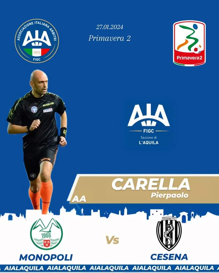 Pierpaolo Carella (AIA L’Aquila) designato come assistente dell’incontro di calcio fra Monopoli e Cesena. Inserito nel programma del campionato Primavera 2, si disputerà domani presso lo stadio “Veneziani” di Monopoli, con calcio d’inizio alle ore 14,30.