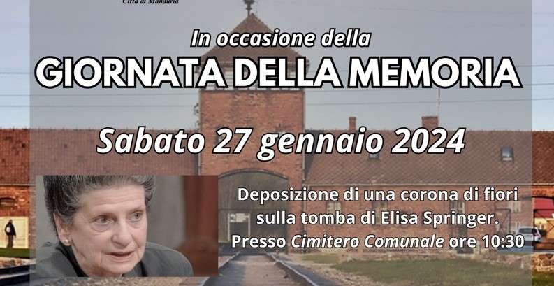 Domani (sabato 27 gennaio), alle ore 10;30, presso il cimitero comunale, il sindaco, gli assessori e i consiglieri depositeranno in collaborazione con l’ANPI, sezione di Manduria, due corone di fiori sulla tomba di Elisa Springer, nostra amata concittadina, ebrea deportata nei campi di sterminio di Auschwitz, che con la sua intensa testimonianza di vita ha lasciato a intere generazioni un accorato appello alla pace e al rispetto tra gli uomini.