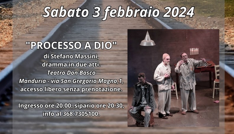 Sabato 3 febbraio, alle ore 20, presso il teatro Don Bosco si terrà la rappresentazione teatrale ‘Processo a Dio’, della compagnia Theatrum, un dramma in due atti di Stefano Massini, in cui si ricostruisce il dramma dell’uomo travolto dalla violenza della Shoah, costretto a porsi domande esistenziali sulla vita e su Dio.