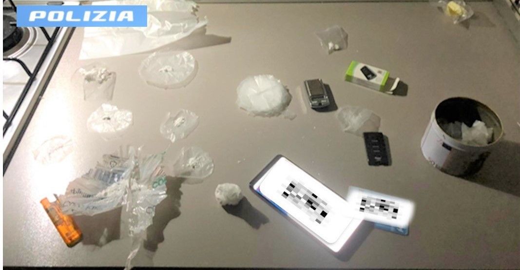 L’operazione antidroga ha dato ben presto i suoi frutti confermando quanto sospettato: sul piano della cucina i poliziotti hanno recuperato circa 25 grammi di cocaina parte ancora in pietra, tutto il necessario per il suo confezionamento e quasi 400 euro in banconote di piccolo taglio che erano all’interno di un bicchiere di plastica poggiato su un mobile dell’ingresso.