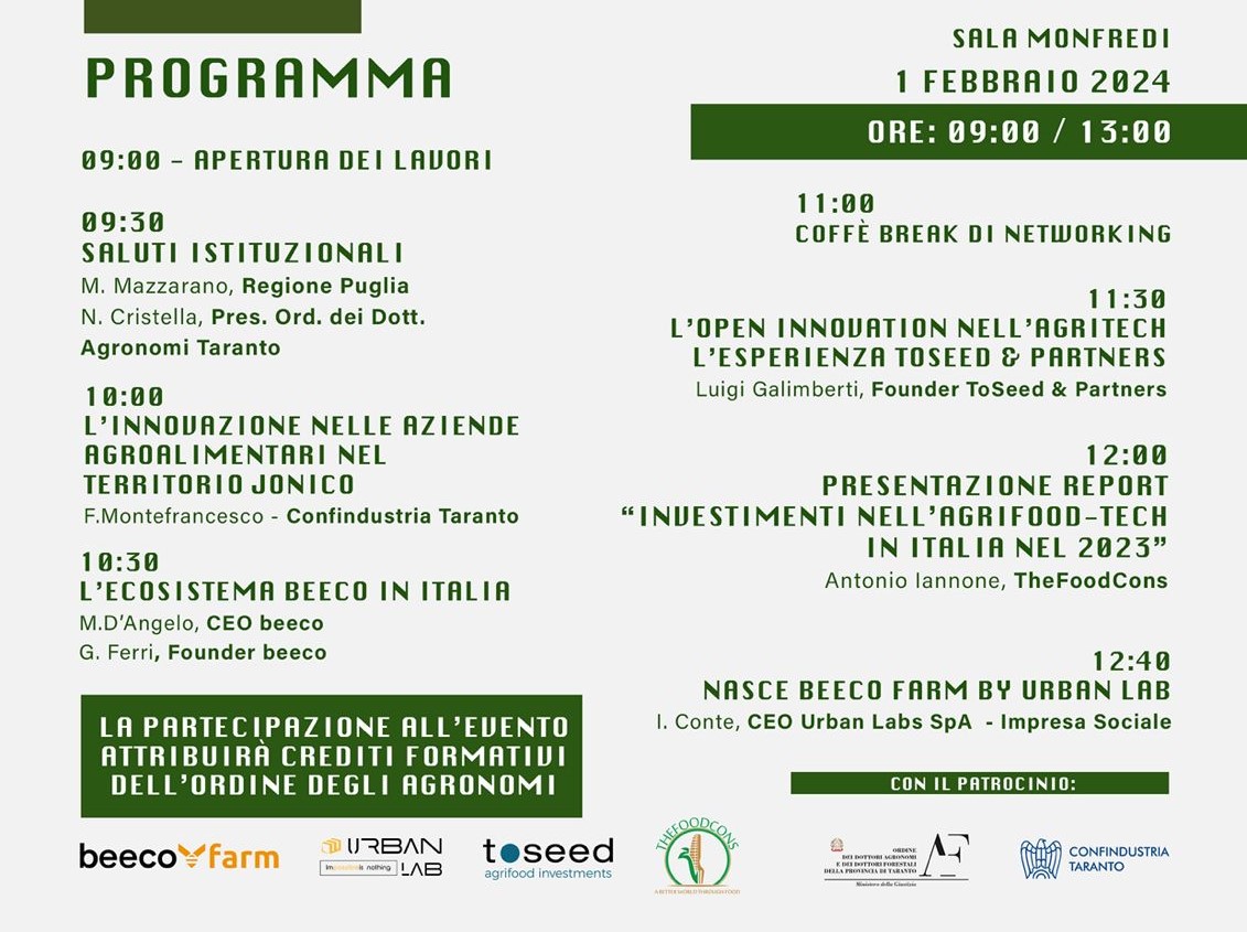 L’evento, accreditato con la FPC per gli Agronomi, gode del patrocinio di: beeco, Urbanlab, ToSeed & Partners, TheFoodCons, Ordine dei dottori agronomi e dei dottori forestali della provincia di Taranto, Confindustria Taranto. A moderare i lavori sarà Domiziana Bianchi.