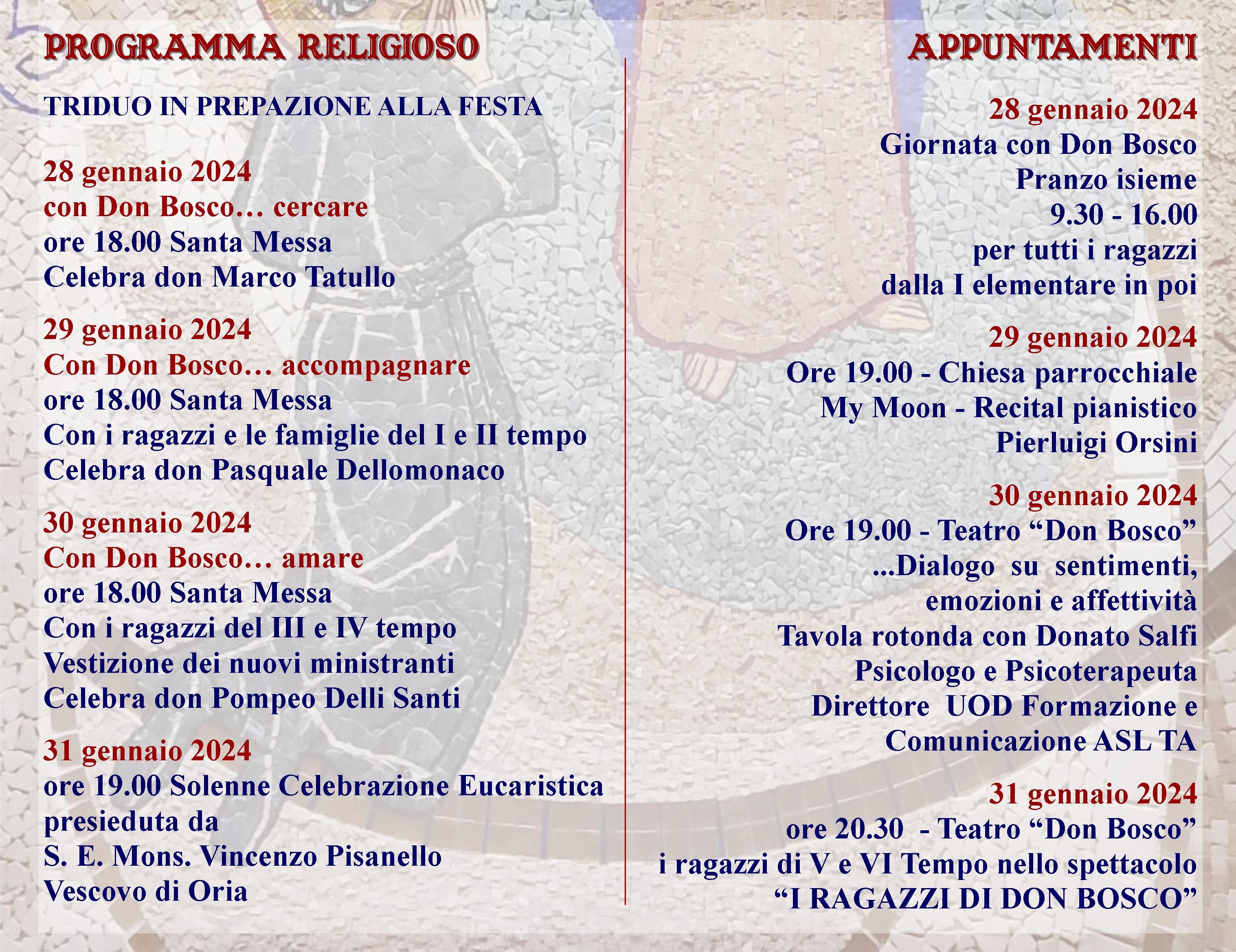 La parrocchia S. Giovanni Bosco di Manduria si appresta a celebrare la festa del Santo che tanto amava i giovani. Festa preceduta da una settimana piena di appuntamenti, come la “Giornata con Don Bosco” vissuta tra giochi e pranzo insieme da circa 200 ragazzi, il concerto pianistico del musicista Orsini, la tavola rotonda moderata da Donato Salfi sul tema dell'affettività.